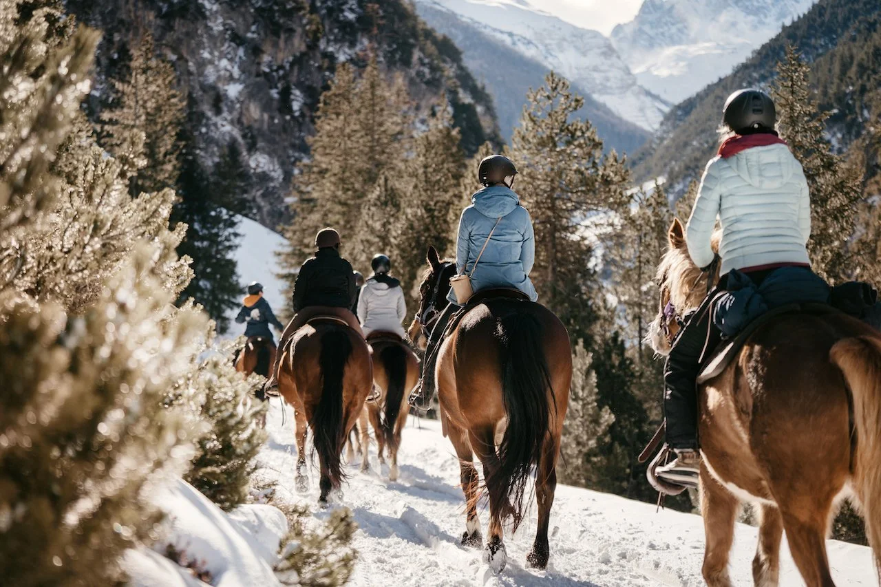 Auf dem Rücken der gutmütigen Pferde von San Jon hast du jede Menge Zeit, um in den verschneiten Wäldern Energie zu tanken und die imposante Bergkulisse zu bestaunen.