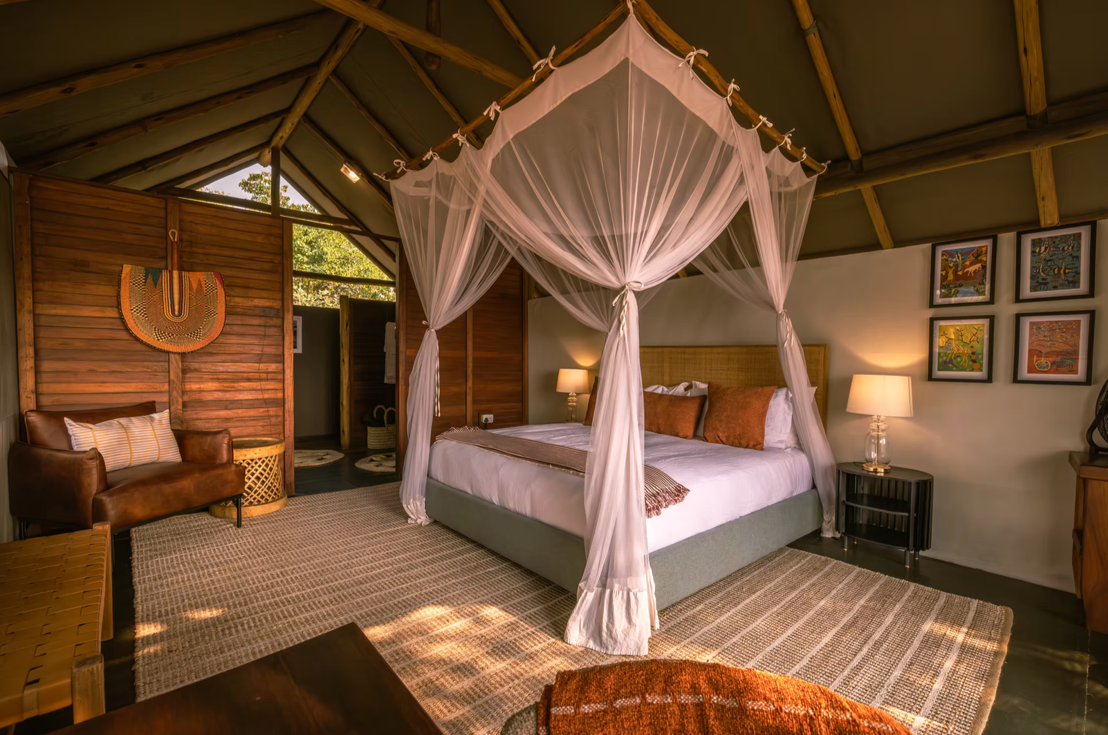 Die vier Bungalow Zelte bieten eine aussergewöhnlich komfortable und stilvolle Unterkunft. Ausgestattet mit Ventilatoren für eine angenehme Brise, einem eigenen Badezimmer mit kräftiger Warmwasserdusche, hochwertiger Bettwäsche und wunderschönem Blick auf den Fluss wird selbst die Siesta zu einem besonderen Moment.