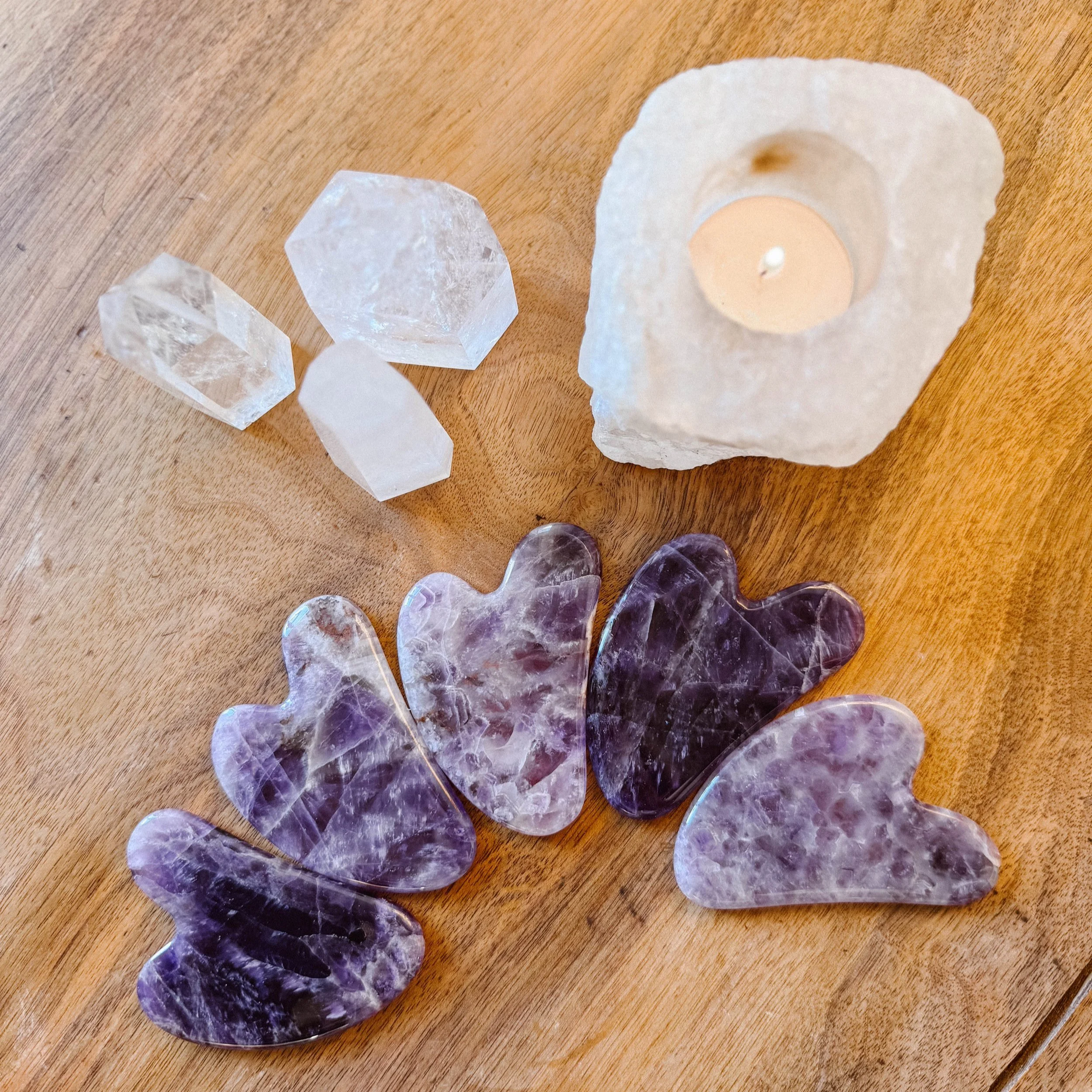 Die Gua Shas nutze ich jeweils in meinen Reiten- und Yoga-Retreats, und alle sind immer begeistert, wie sich das Gesicht danach anfühlt und wie die Haut strahlt. Daher gibt es die Gua Shas nun auch hier im Shop. Du kannst zwischen Rosenquarz, weisser Jade, grüner Jade, grünem Aventurin, schwarzem Obsidian und Opalit wählen. Jeder Stein ist einzigartig und kommt schön verpackt zu dir nach Hause.