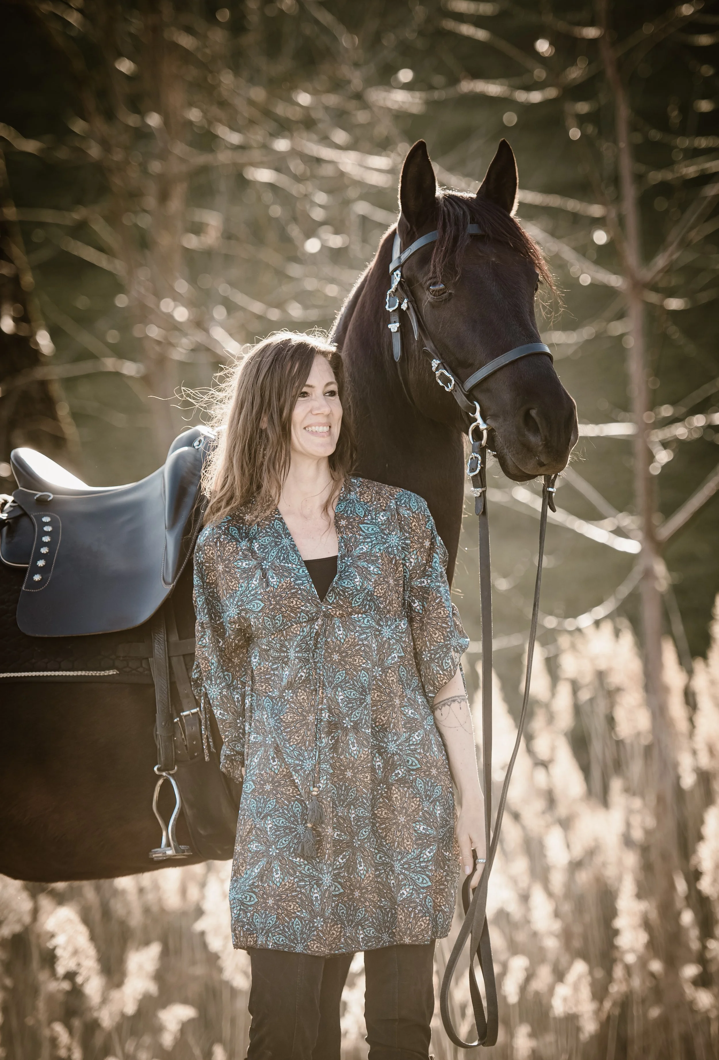Doch schon lange bevor Yoga mein Leben bereicherte, gab es eine andere grosse Liebe: die Pferde. Seit ich denken kann, begleiten sie mich, und das Reiten ist für mich Ausdruck von Freiheit, Magie und tiefer Verbundenheit mit der Natur. Vor einigen Jahren konnte ich meinen grossen Traum verwirklichen und habe mir in Spanien einen schwarzen Hengst gekauft. Inzwischen lebt Lince als Wallach in der Schweiz und wir haben zusammen viel Spass mit ausgiebigen Ausritten, üben uns in der Alta Escuela - eine traditionelle, klassische Reitkunst aus Spanien und geniessen unsere Verbundenheit mit spielerischer Freiheitsdressur.